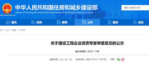 按照《行政许可法》及有关建设工程企业资质管理规定,我部对近期申请建设工程企业资质的申报材料组织了专家审查,现将专家审查意见在住房和城乡建设部门户网站(https://www.mohurd.gov.cn)予以公示,以广泛接受社会监督。企业申报材料中的人员、代表工程业绩等详细情况,可通过点击“住房和城乡建设部门户网站→建设工程企业资质行政审批专栏→资质申报基本信息公示”进行查询。